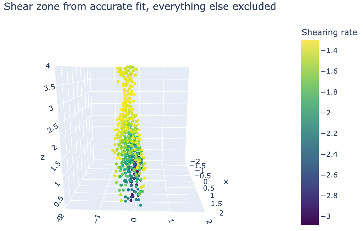 l=0, r=0, b=0, t=40), title="Shear zone from accurate fit, everything else excluded", scene_aspectmode='cube')