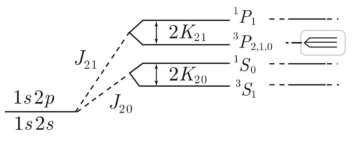 For the description of the two-electron states of the atom, we use the notation , where with being the total angular momentum. Instead of we use the conventional notation , respectively. Due to the addition rules of angular momenta, for the singlet states , is unambiguously defined, . These levels are times degenerate. The states, or in other words, the and states can have , so this level is times degenerate. We can see that this level is going to split according to the three different values of due to spin-orbit coupling as noted on the figure.