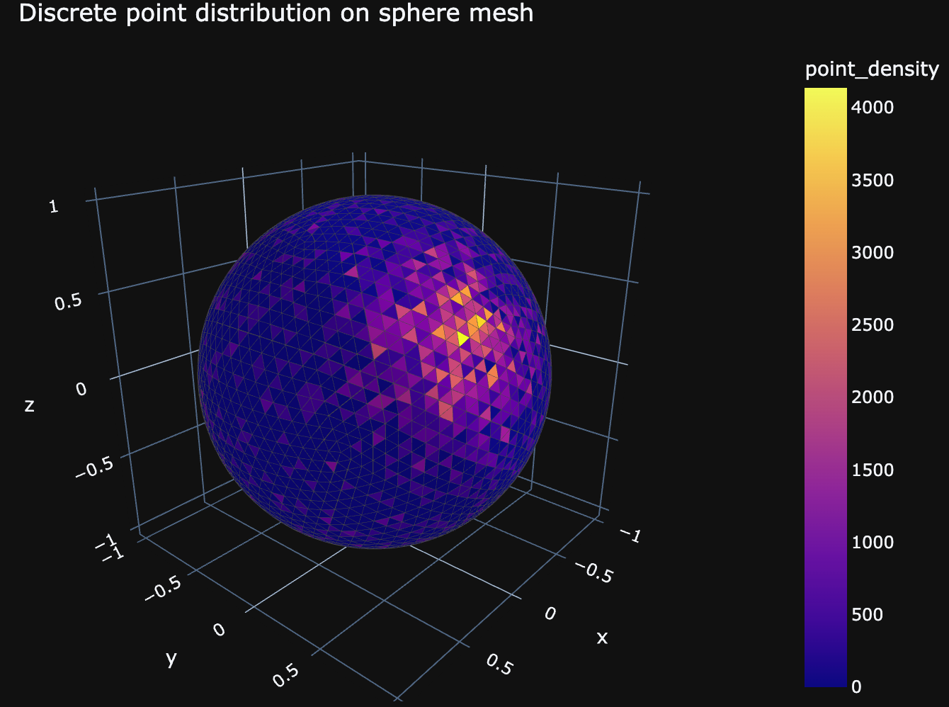 fig.update_layout(title='Discrete point distribution on sphere mesh', margin={'autoexpand': True,'b': 5,'l': 5,'r': 5,'t': 30,}, autosize=True, width=700, height=500, template="plotly_dark")